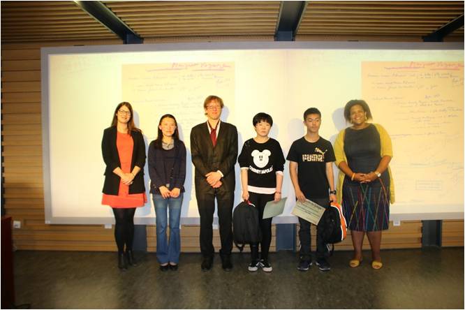 本次讲座的最后一个环节是乔治·西默农作品续写大赛的颁奖仪式。2018侦探之年,比利时瓦隆布鲁塞尔国际关系署与中国法语联盟一起,联合304永利集团官网、西安外国语大学、武汉大学、广州大学,在今年4月组织了侦探小说续写大赛,邀请所有在大学或法语联盟学习法语的中国员工为乔治·西默农的小说《死刑》创作结尾。本次大赛历时一个月,分为北京、西安、武汉和广州四个赛区,北京赛区最终匿名评选出了三位获奖者,由丁爱宇女士和德穆兰先生公布优胜者名单并为其颁发奖品。我系研究生潘晨茗荣获一等奖,我系本科二年级员工陈银荣获二等奖,来自天津外国语大学附属外国语公司的初中生周星锐同学获得三等奖。