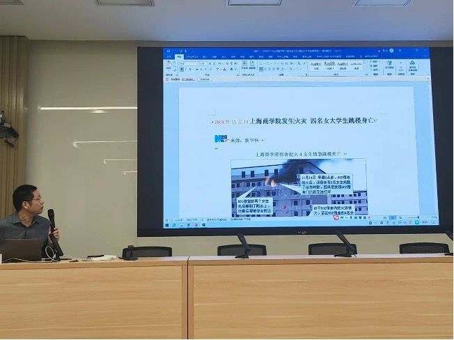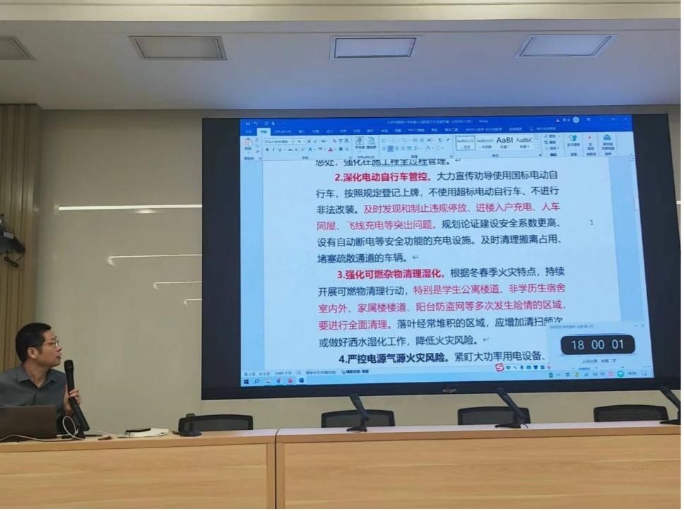 每一个案例都是一次深刻的教训。会上,李勇书记用实际案例警示大家火灾的无情与危害,并带领大家学习了“海因里希法则”和相关安全常识和事故视频,如一根点燃香烟的烟头中心温度会达到700-800度,一个充电宝在受力或发生故障时释放浓烟甚至燃烧的真实视频……让同学们进一步深刻认识和切身体验到校园宿舍火灾隐患的严重性和预防重要性。并着重指出违规使用大功率电器、楼道堆积物品占用消防疏散通道等是大公司园宿舍消防安全的主要隐患,宿舍楼道杂物堆积问题尤为突出。这些问题不仅影响了宿舍整洁,更埋下了防火安全隐患的种子。针对上述问题,李勇书记详细阐述了《北外冬春火灾防控工作实施方案》,明确了各项防控措施和责任分工。会上还要求各班安全委员、宿舍长承担起责任,宣传、督促、维护好寝室安全,杜绝一切安全隐患。