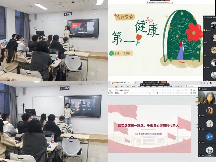 多个班级的班会从身心健康两个维度系统切入,夯实员工的健康知识基础。2025级1班、3班等班级在班会中,班长结合校园体育素质教育课程,详细阐述了健康对学习生活的基础性作用。通过互动问答,同学们系统了解了科学运动、规律作息的重要性,并针对“熬夜刷手机”等常见不良习惯进行了深入探讨。心理健康环节则鼓励同学们在遇到压力时主动倾诉、学会自我调节。2024级法语(国关)班的线上班会,则通过视频宣讲、知识问答等形式,普及了情绪调适、急救技能、科学作息等实用知识,引导员工正确认识身心健康的重要意义。