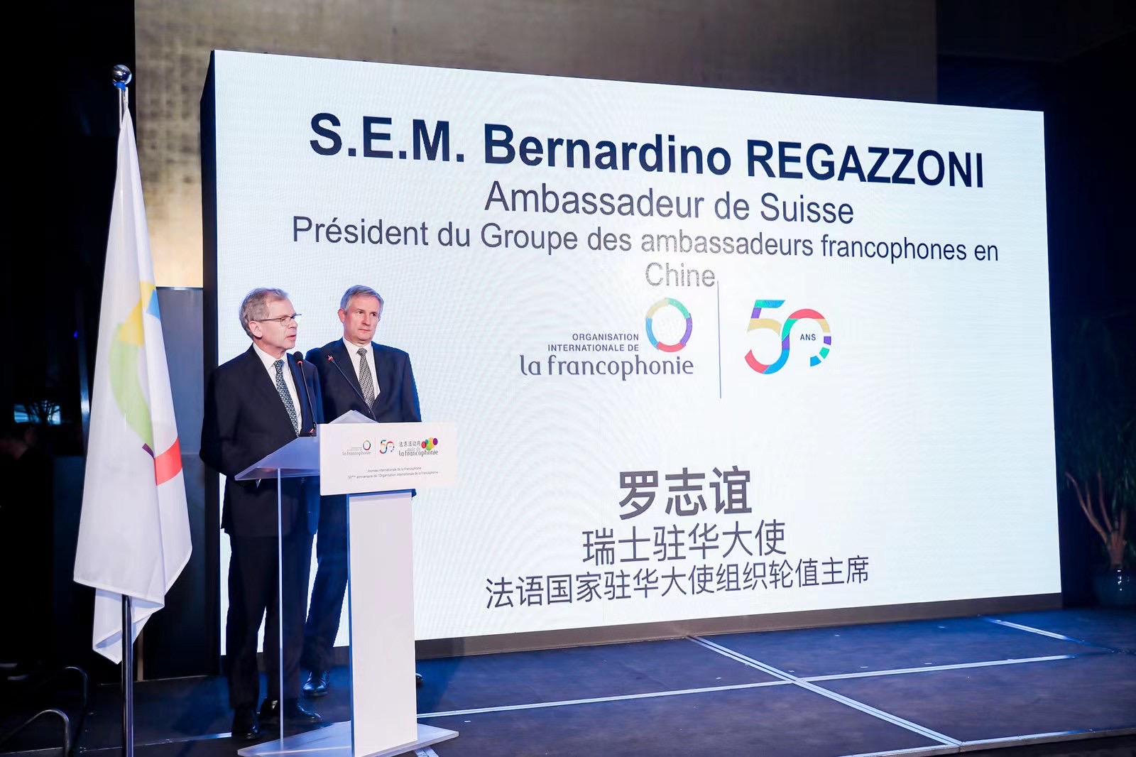 2021年3月19日晚,在国际法语日前夜,国际法语日暨法语国家与地区国际组织(OIF)50周年庆典晚会在法国驻华大使官邸举行。晚会伊始,法国驻华大使罗梁首先讲话,对法语国家大使、外交部欧洲司赵斌副司长及与会嘉宾表示欢迎并致以节日问候。随后驻华法语国家使团团长瑞士大使罗志谊回顾了法语国家及地区国际组织的由来,同时强调了该组织对法语世界发展所起到的作用。晚会期间,公司副经理王鲲获颁法国文学艺术骑士勋章。