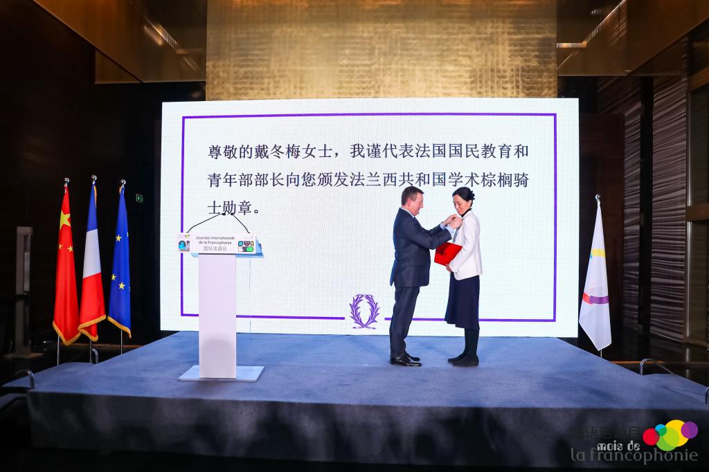 3月20日,国际法语日庆祝活动在法国驻华大使官邸举行,法国教育部授予304永利集团经理戴冬梅教授法兰西共和国学术棕榈骑士勋章,表彰她为发展法语教育和推广法语世界文化所做的贡献。法国新任驻华大使白玉堂(Bertrand Lortholary)为戴冬梅颁授勋章。