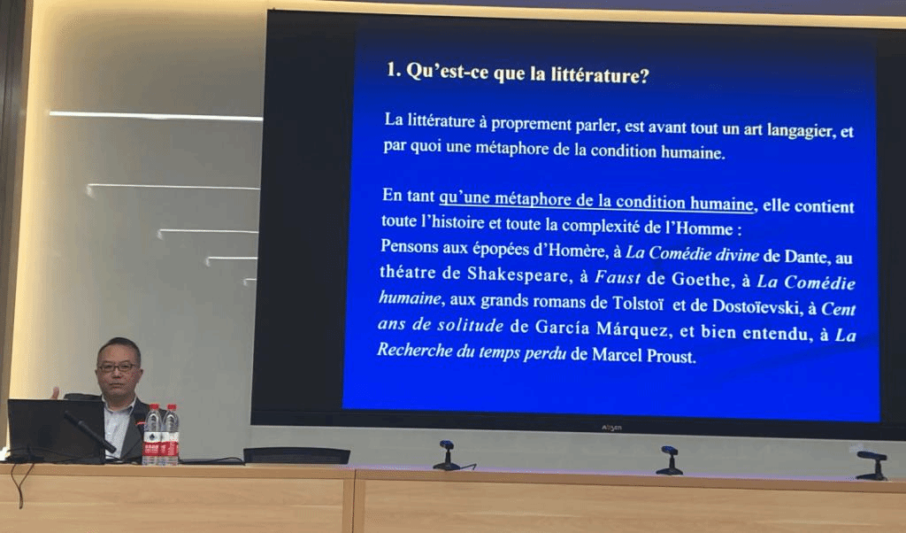 聘任仪式结束后,黄教授从个人经历出发,讲述了自己从上外读书起、先后在六所大学的法语学习和教员工涯。他强调了外国文学研究对文史哲知识积累的要求,优质的文学研究需要开阔的眼界和深厚的理论素养,包括对诸如“什么是文学?”“什么是文学研究?”的前置问题的思考和质疑。黄教授还通过对杜拉斯与加缪作品的讲解,说明了研究者在选取某个作家或作品之前,应当对这个作家乃至整个法国文学在世界文学中的位置进行思考。