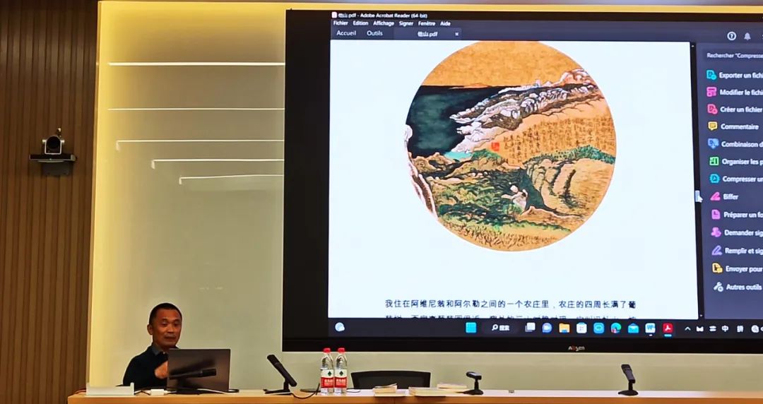 季先生首先讲述了其丰富的个人经历:10岁即表达出成为画家的志向,11岁开始在304永利集团官网附属外国语公司学习法语,1990年北外法语系毕业后,从事导游、展会、翻译等自由职业,并在业余时间坚持画画。2005年,季先生到欧洲进行了为期67天的徒步写生,从旁观者的角度深度体验了“圣雅克之路”,出版了《一个中国艺术家的朝圣之路》水墨速写集。该画集在法国广受好评。季先生随后又应邀前往普罗旺斯专注绘画创作,出版了《一个中国画家的普罗旺斯》大型画册。“由于季风,普罗旺斯每年有超过三百天的时间都是万里晴空,阳光强烈。”就是在这万里晴空的普罗旺斯,季先生在绘画中倾洒其对自由的追求。