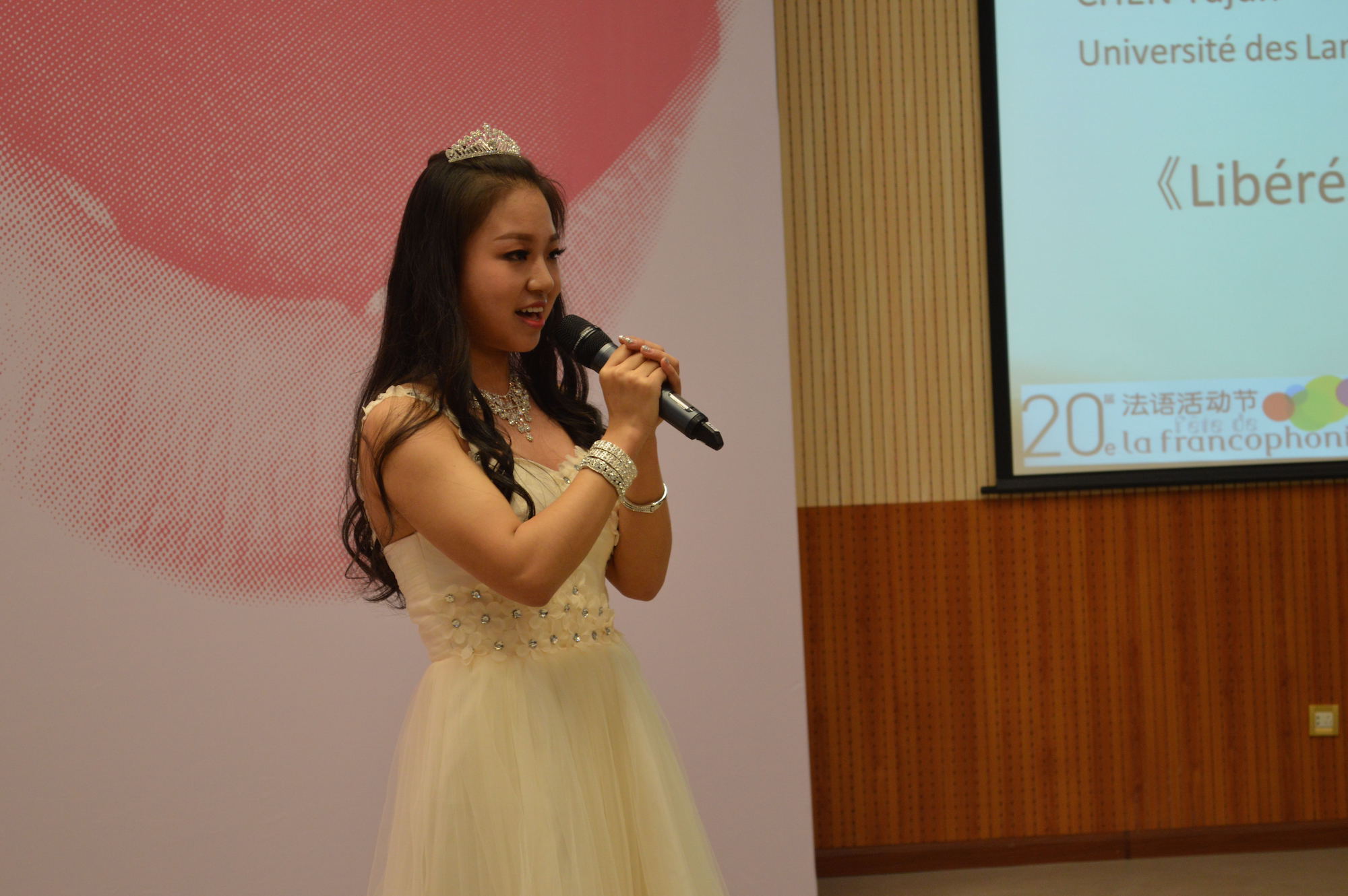 3月29日,由法国驻华大使馆和法语系主办的第15届全国法语歌曲大赛决赛在阿语楼国会厅如期举行。作为第20届法语活动节的压轴盛宴,本次比赛主题为“爱与20岁”。近60名来自全国各地的法语歌手参加了本次比赛。评委由法国与瑞士使馆代表、法语教学单位教师和上届法语歌曲大赛优胜选手组成。决赛的最后环节,著名法国女歌手Joyce Jonathan作为特邀嘉宾进入评委。除了唱歌外,选手还要同评委进行法语问答。
