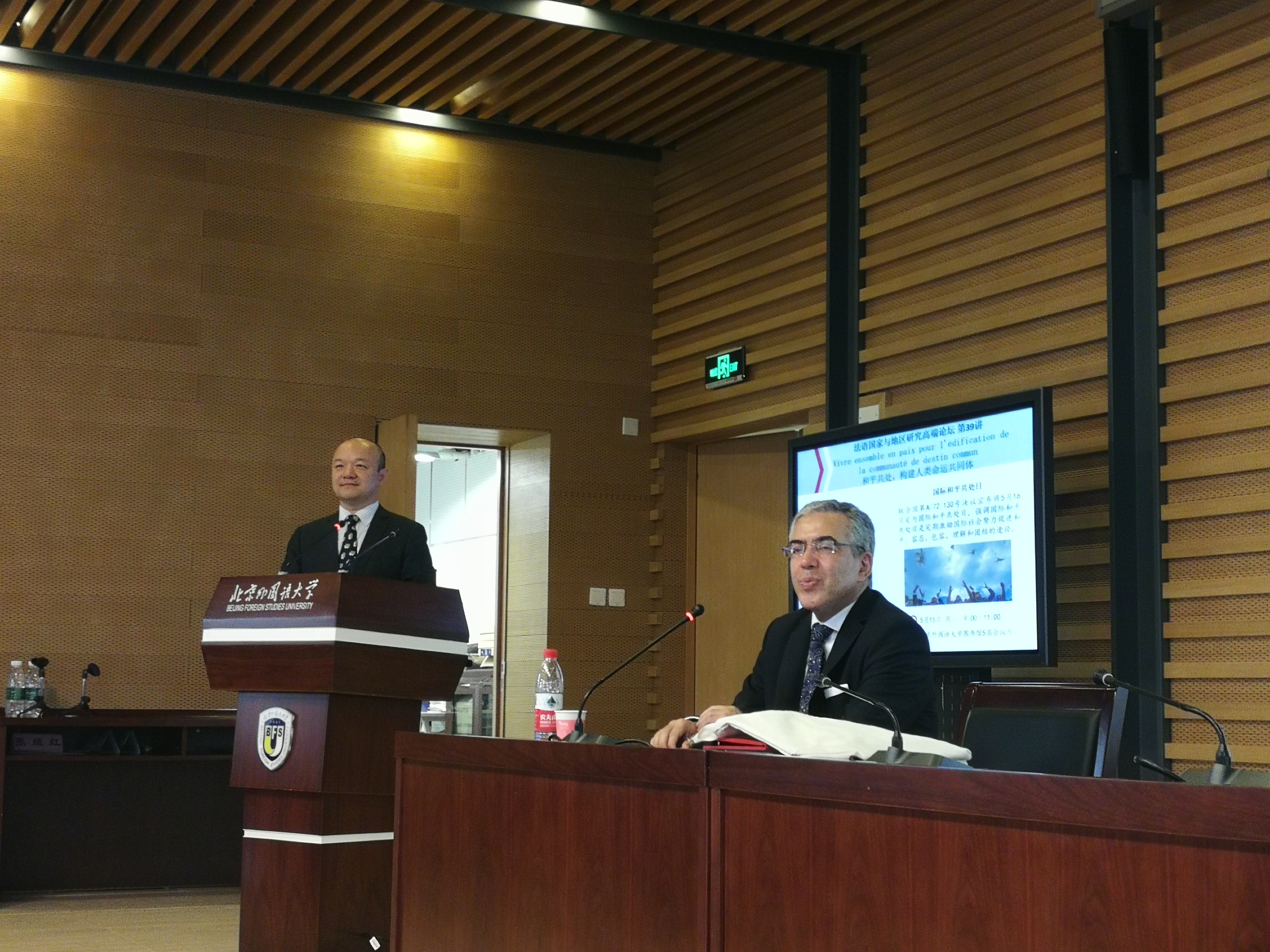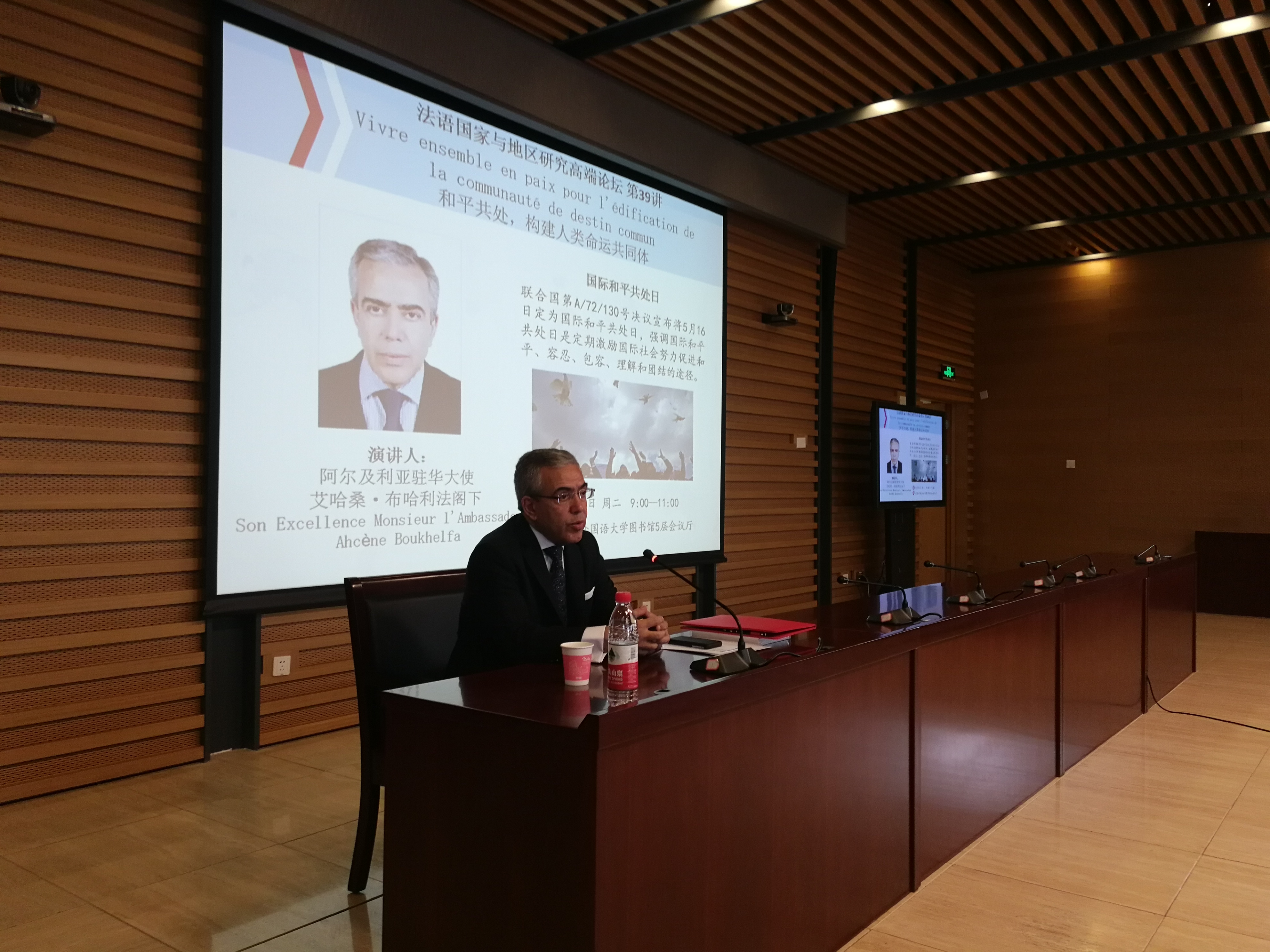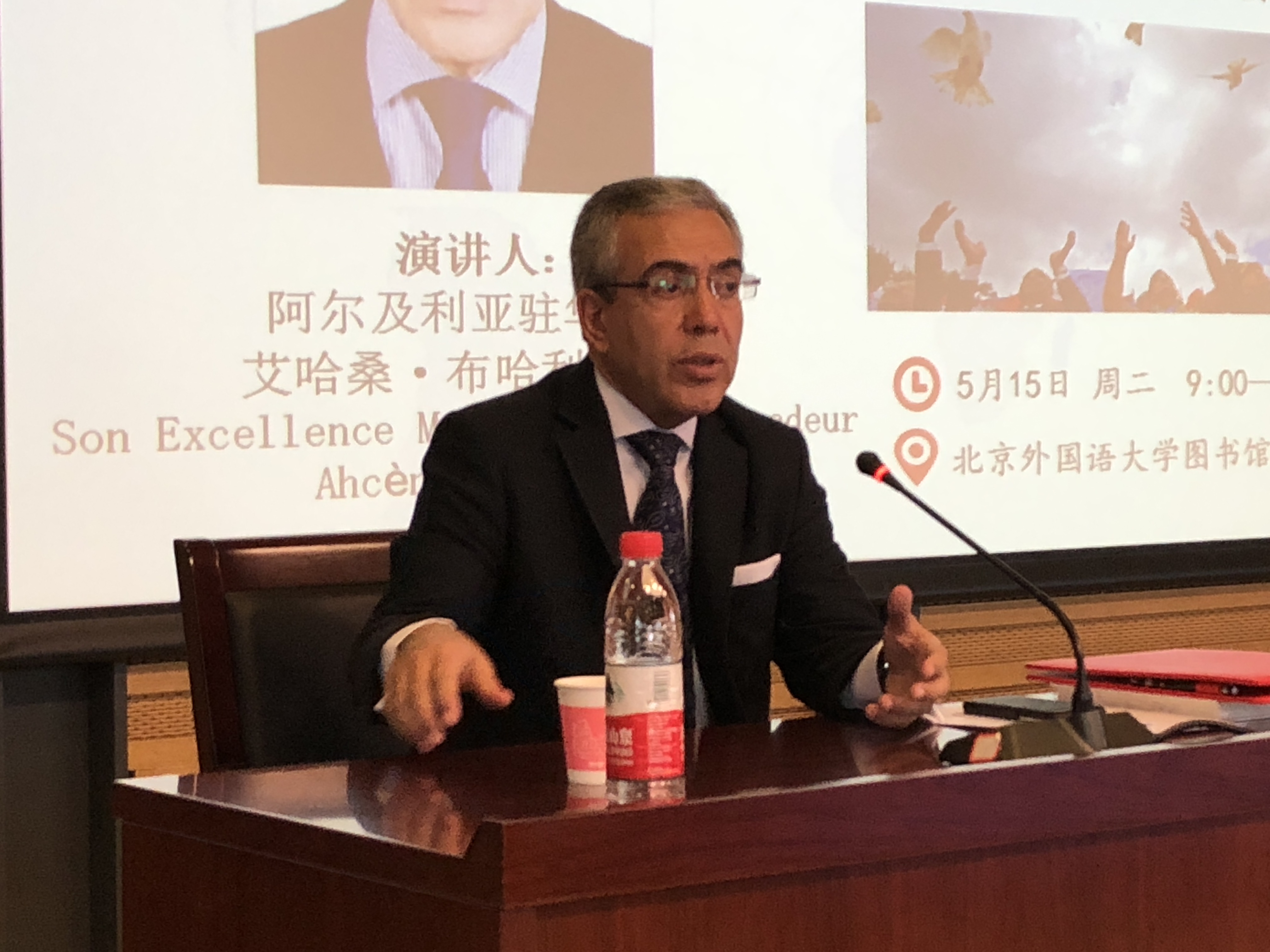 5月15日上午,阿尔及利亚民主人民共和国驻华大使艾哈桑·布哈利法阁下(Ahcène BOUKHELFA)应邀访问公司,并在公司图书馆五层会议厅发表了题为《和平共处——构建人类命运共同体》的演讲,以庆祝第一个“国际和平共处日”的到来。本次活动由公司法语系副主任王鲲主持。