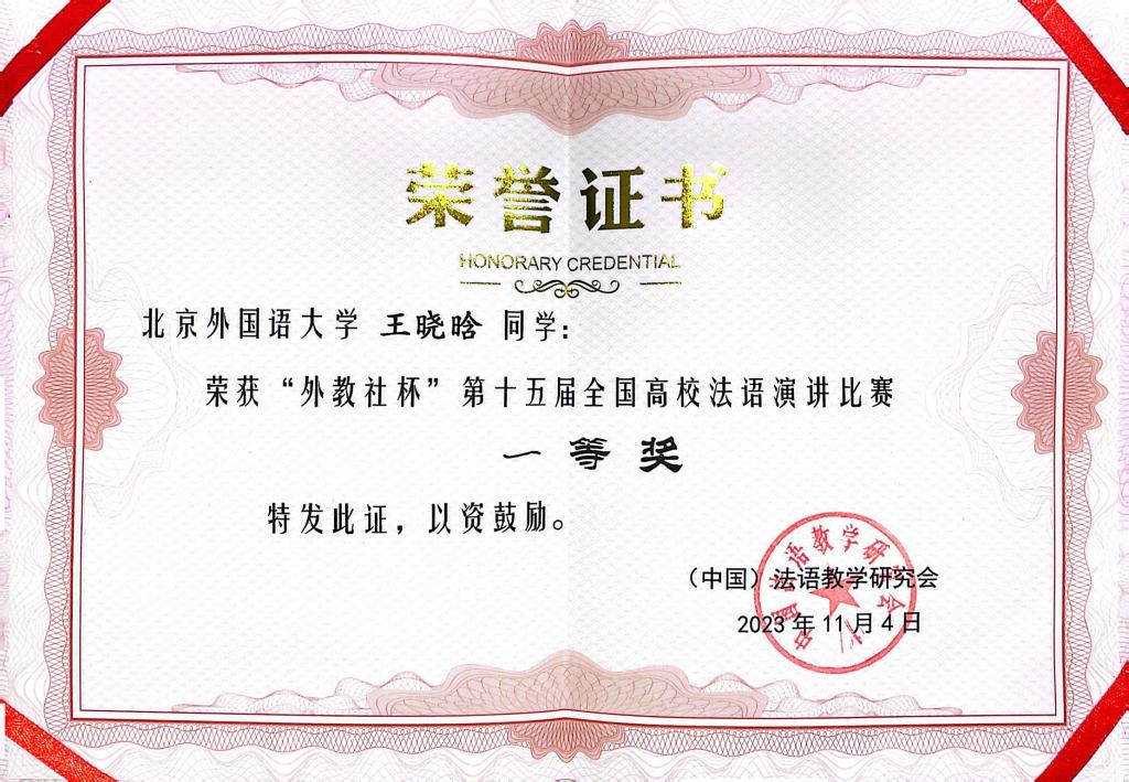 全国高校法语演讲比赛迄今已顺利举办了15届,是法语学科国内高校最高水平的赛事,旨在展示和提升全国高校法语专业教学水平,交流和提高法语专业员工的语言能力和思维能力。王晓晗同学发挥出色,表现了公司员工的风采,也为公司赢得了荣誉。