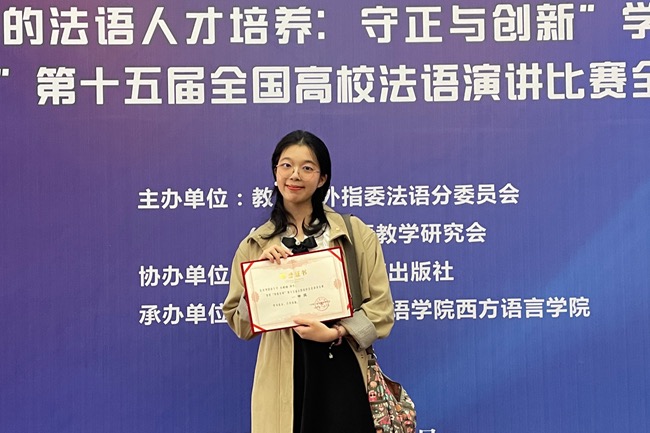 2023年11月4日上午,第十五届“外教社杯”法语演讲大赛总决赛在浙江越秀外国语公司成功举办。本次大赛由教育部外指委法语分委员会和中国法语教学研究会主办,上海外语教育出版社协办,浙江越秀外国语公司西方语言公司承办。公司本科2021级王晓晗同学凭借扎实的语言功底、大方的演讲仪态和出色的临场应变能力,荣获本次比赛一等奖。