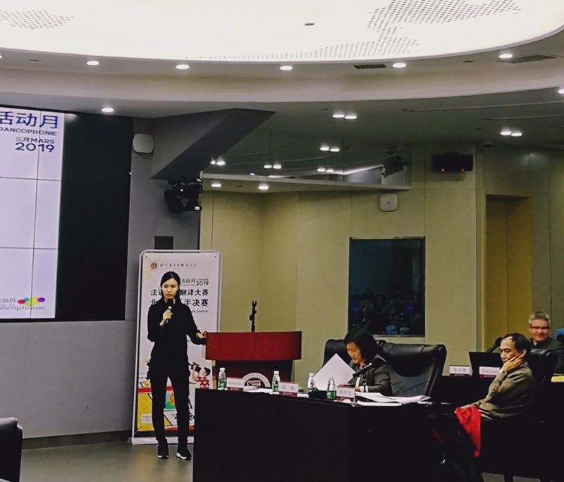 殷楚薇首先同学就自己翻译的作品:皮埃尔•维勒迪的《演奏者》,与评委讨论了对诗歌的感悟和理解,而后,与其余四位参赛选手一同就让•塔迪厄的《文字游戏》与评委进行了深刻的交流。经商讨,评委宣布最终比赛结果。殷楚薇同学第三名。