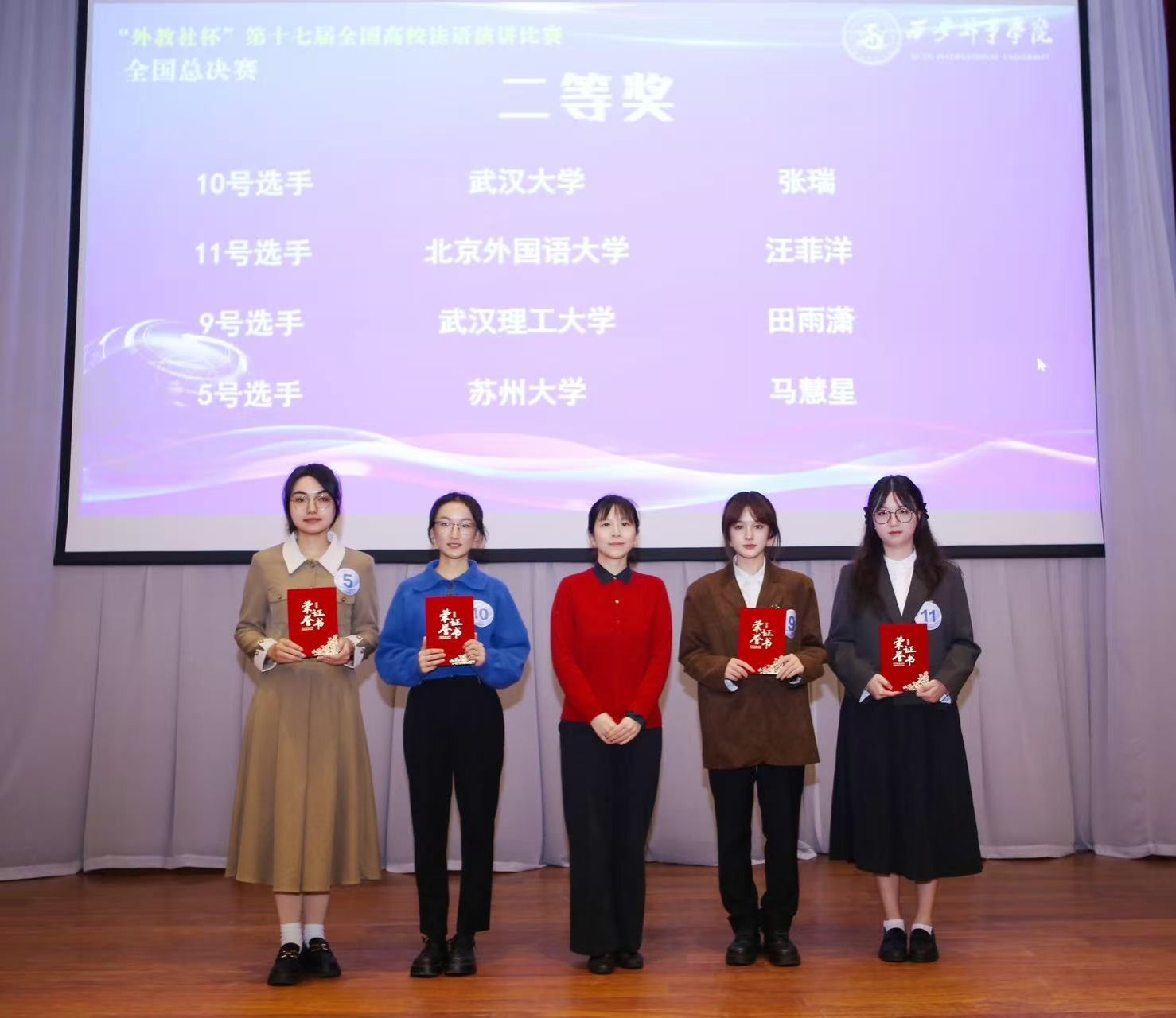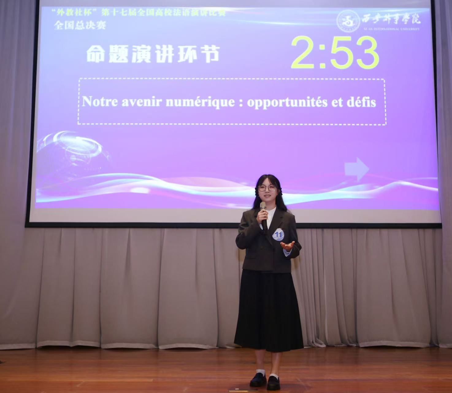 11月8日,2025教育部外指委法语分委员会(中国)法语教学研究会联席会议暨“外教社杯”第十七届全国高校法语演讲比赛在古城西安顺利举行。本次会议由西安外事公司和中国法语教学研究会联合主办,上海外语教育出版社赞助支持。304永利集团2022级本科生汪菲洋凭借出色发挥,在比赛中荣获全国二等奖。