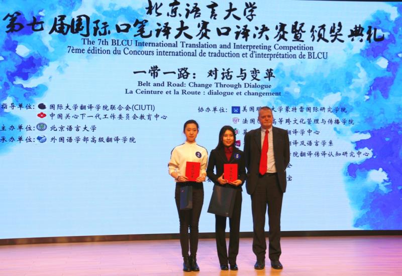 (国际译联主席Maurizio Viezzi先生为法语交传和英语交传组一等奖选手颁奖,左为甄权铨)