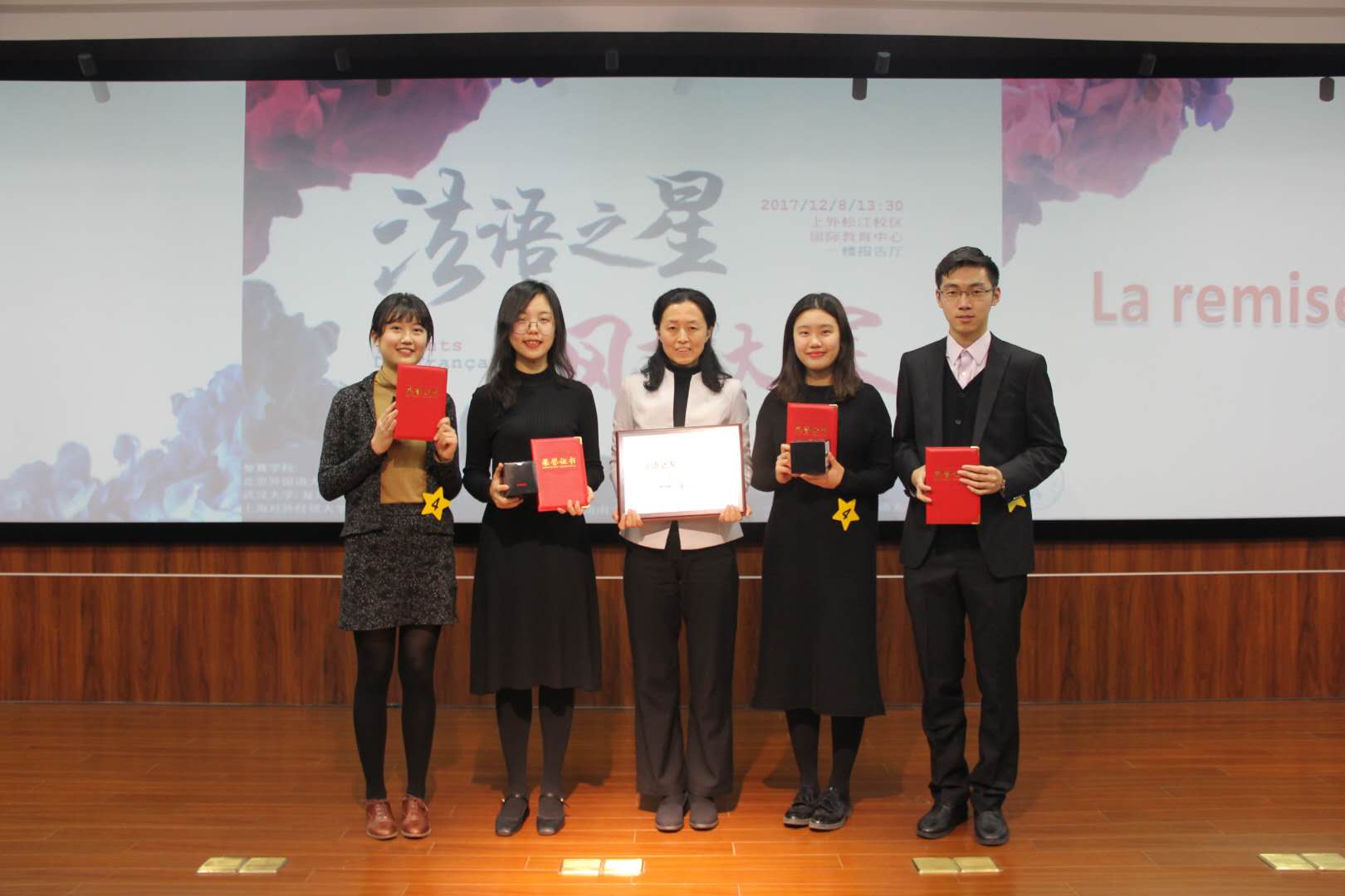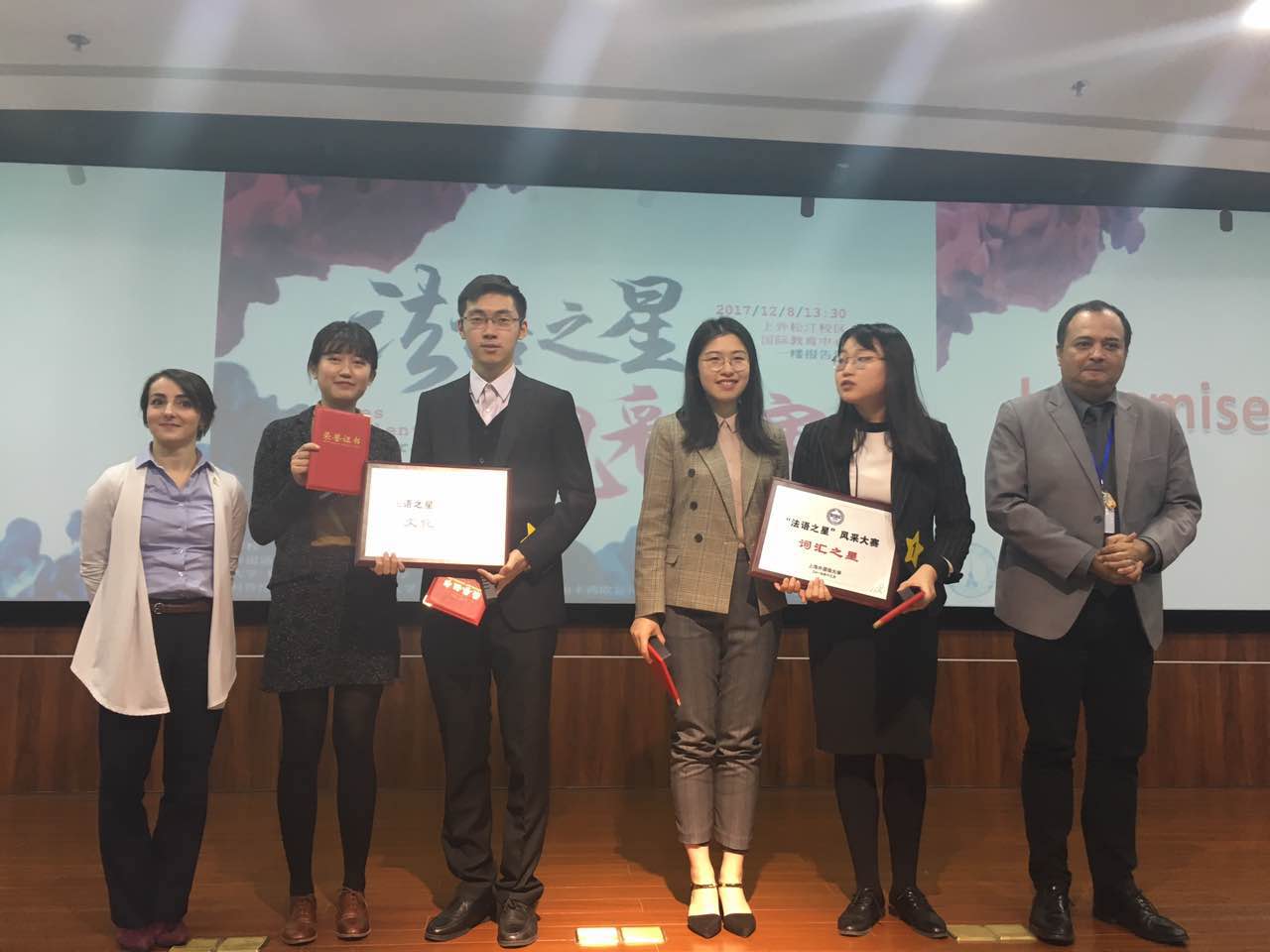 12月8日下午,上海外国语大学举办的第九届“法语之星”风采大赛在上外松江校区举行。经过一个下午的激烈角逐,我系2014级本科生鲜杨、何润哲、罗婉匀和沈逸舟4名同学组成的代表队在演讲环节与文化知识问答环节中均取得第一名的佳绩,荣获“演讲之星”一等奖和“文化之星”奖。