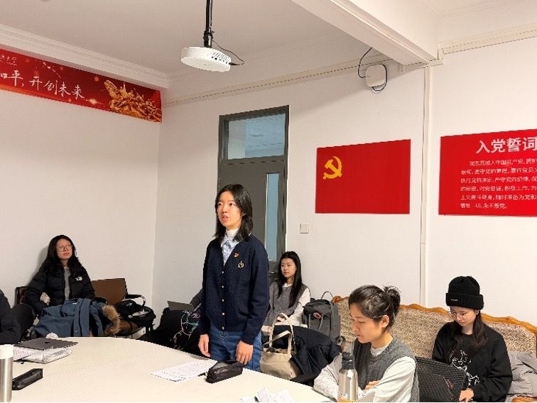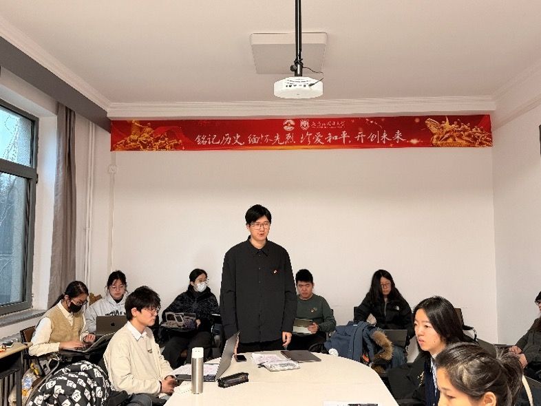 章文天同学以“胸怀天下,语通中外”为主题,结合中法双语志愿服务经历分享体会。她谈到,外语是沟通世界的重要工具,更承载着传递中国理念与中国主张的使命。面对世界百年变局,她认为外语青年既要精通语言,也要提升政治素养,努力成为兼具家国情怀与全球视野的新时代复合型人才。时尚同学从家族航天科研经历出发,深刻体会到老一辈科技工作者在对外阐释中国技术成果时面临的困境。她意识到,小语种学习者在“破除国际误解、讲好中国科研故事”方面大有可为,未来愿以专业之长服务国家科技叙事。蔡能同学则围绕“中国式现代化的人口规模特征”进行分析,指出西方舆论在环保议题上对中国存在长期偏见。他强调外语青年应承担起“破除误解、阐释国情”的使命,将中国推进“双碳”目标的努力、绿色发展的逻辑以及十四亿人口的民生考量,以国际社会听得懂的方式讲出去,助力构建更加客观、公正的话语环境。刘晋彤同学从“信仰”谈起,认为党的创新理论之所以有力量,是因为它回答了中国向何处去、青年能做什么。她指出,在国际平台上仍常见对中国的偏见与刻板印象,这要求外语学习者主动用专业所长向世界展示真实的中国。她表示将继续加强理论学习、投身国际交流,以实际行动向党组织靠拢。周祺霖同学强调,学习党史与社会主义发展史对于理解当代中国社会逻辑至关重要。外语专业青年应在掌握语言之余提升对中国文化与社会制度的理解,关注海外中国研究的新趋势,以更加主动的姿态构建自主话语体系、破除西方叙事偏见。