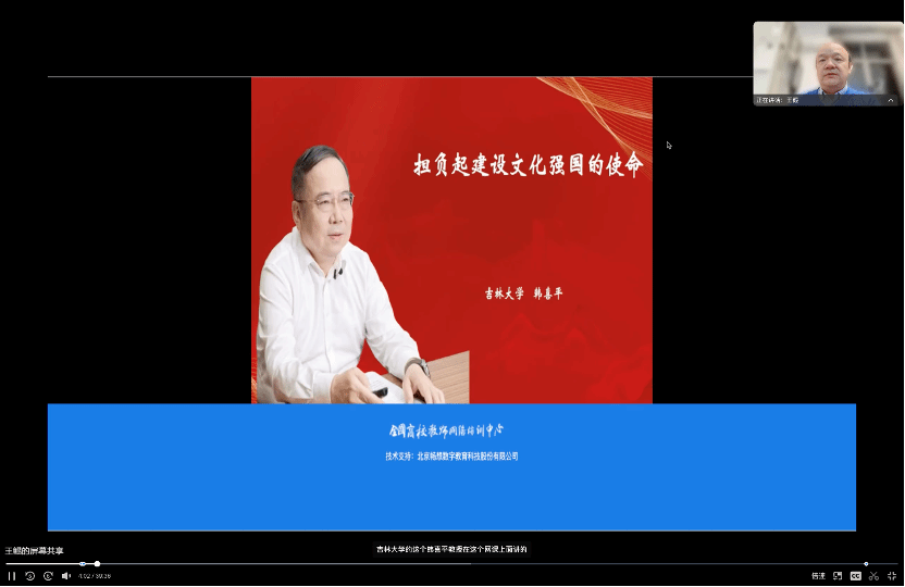 第四讲“担负起建设文化强国的使命”,由教育部“长江学者奖励计划”特聘教授、中央马克思主义理论研究和建设工程首席专家、国务院学位委员会第七届学科评议组成员、吉林大学马克思主义公司韩喜平教授主讲。他曾任“马工程”首席专家和主要成员,主编《毛泽东思想和中国特色社会主义理论体系概论》《马克思主义经典著作选读》《马克思主义发展史》等教材近10部。独著、合著学术著作10余部,由其主编的“十八大主题书系”丛书被评为“全国优秀社会科学普及作品”,所著《中国特色社会主义民生制度建设研究》入选2022年度《国家哲学社会科学成果文库》。