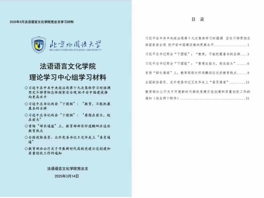与会人员就学习内容进行了充分的讨论,表示将以“钉钉子精神”落实纲要部署和两会精神,立足国际视野,共筑教育强国,为构建人类命运共同体贡献北外“法语”力量!