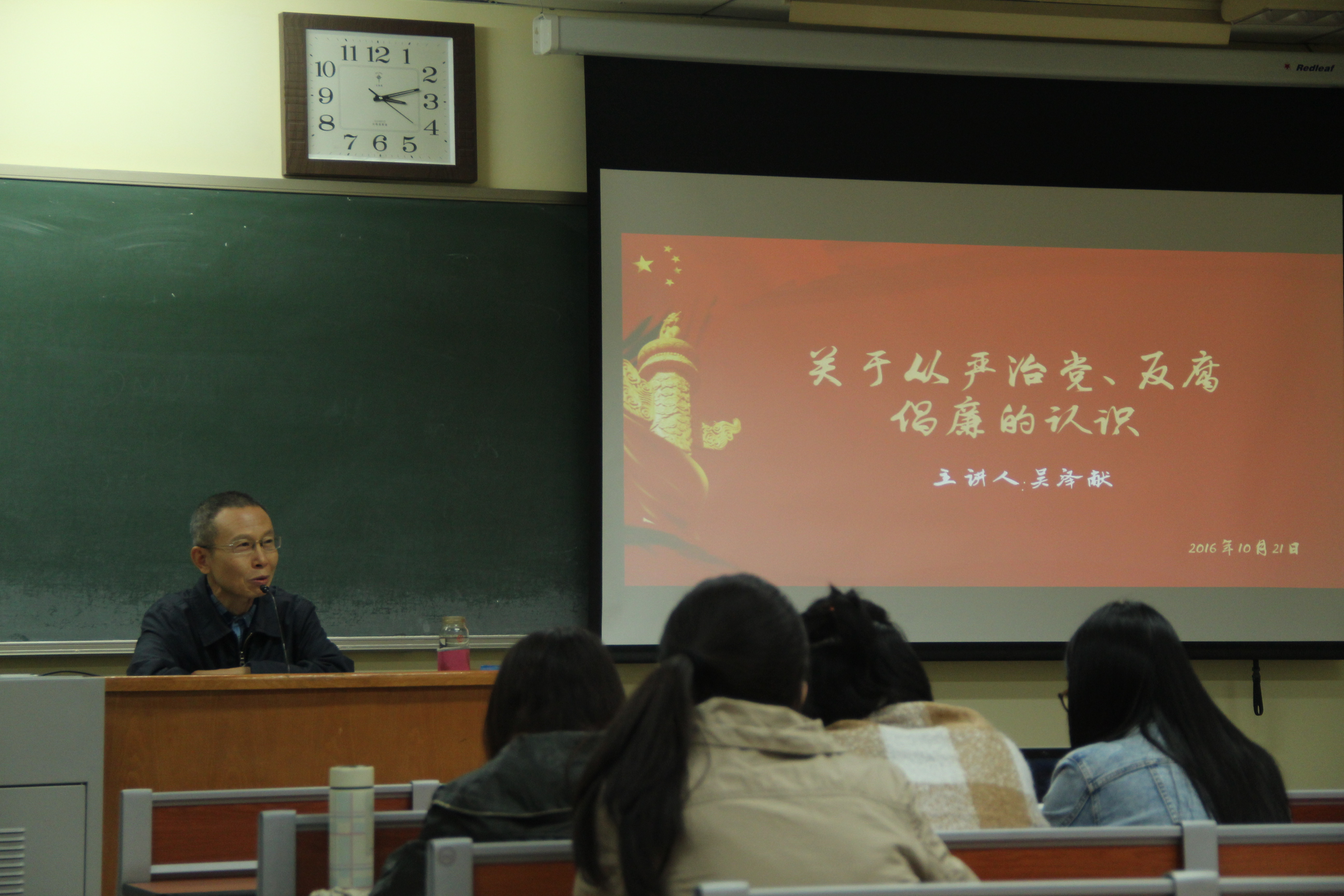 10月21日下午,受法语系党总支邀请,73级员工吴泽献大使为法语系全体党员讲了主题为“从严治党、反腐倡廉”的党课。